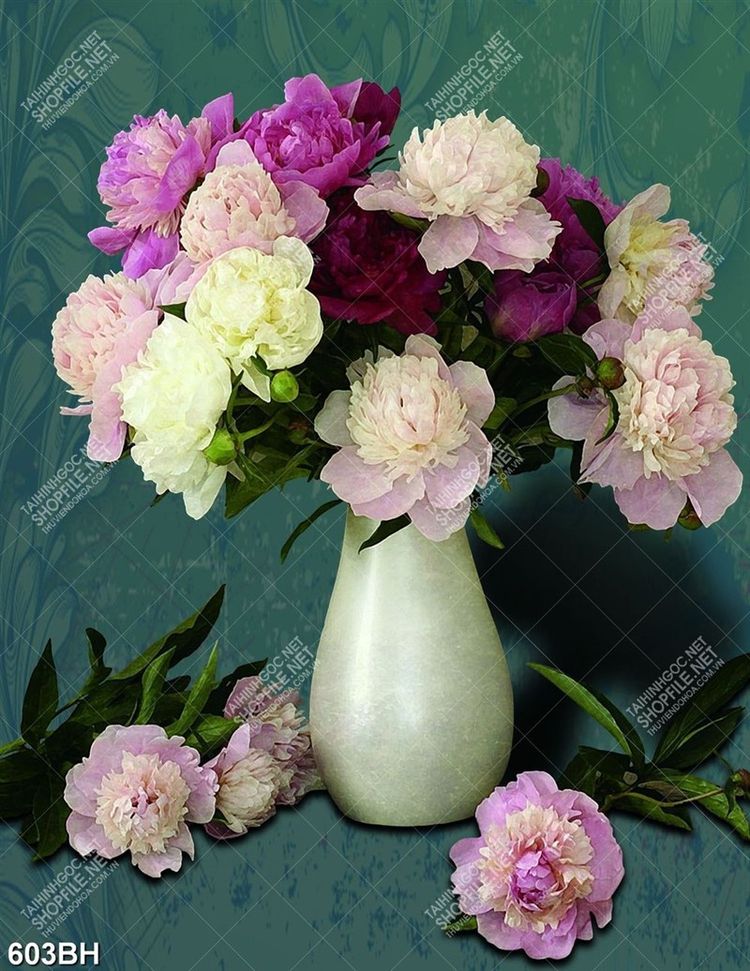 Tranh bình hoa in uv cành hoa mẫu đơn trắng trên tường xanh
