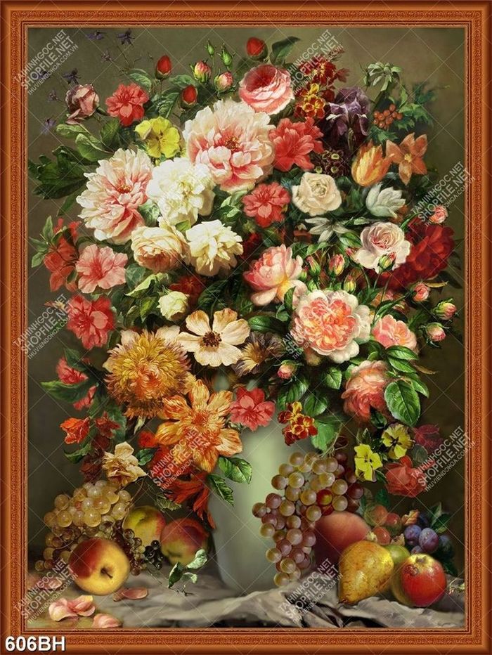 Tranh bình hoa mẫu đơn khoe sắc trên bàn trái cây in canvas