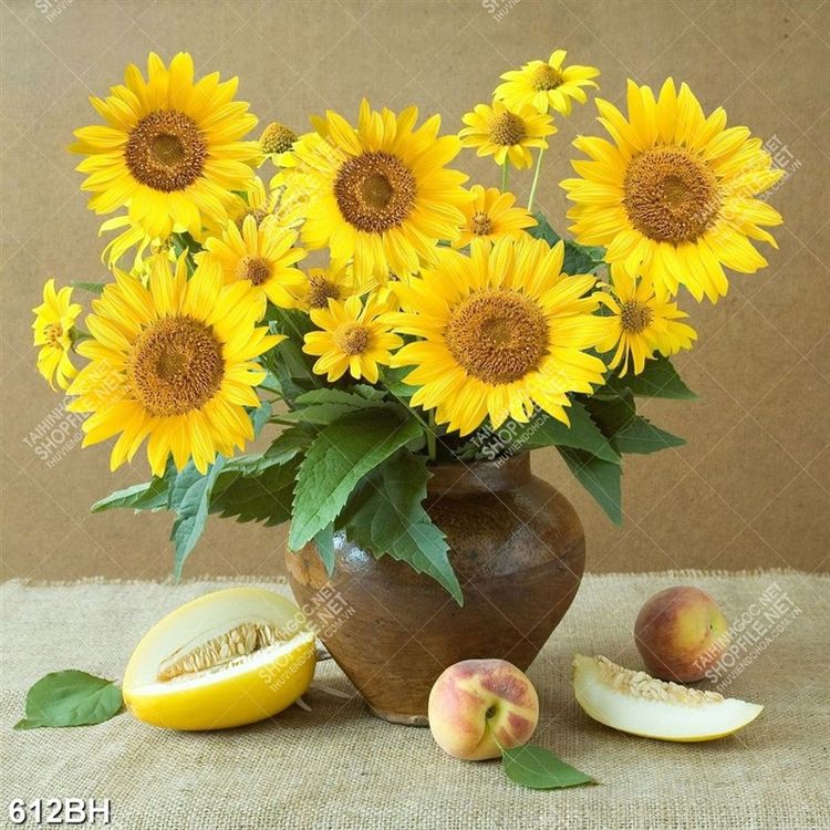 Tranh bình hoa in uv những trái đào bên bông hướng dương