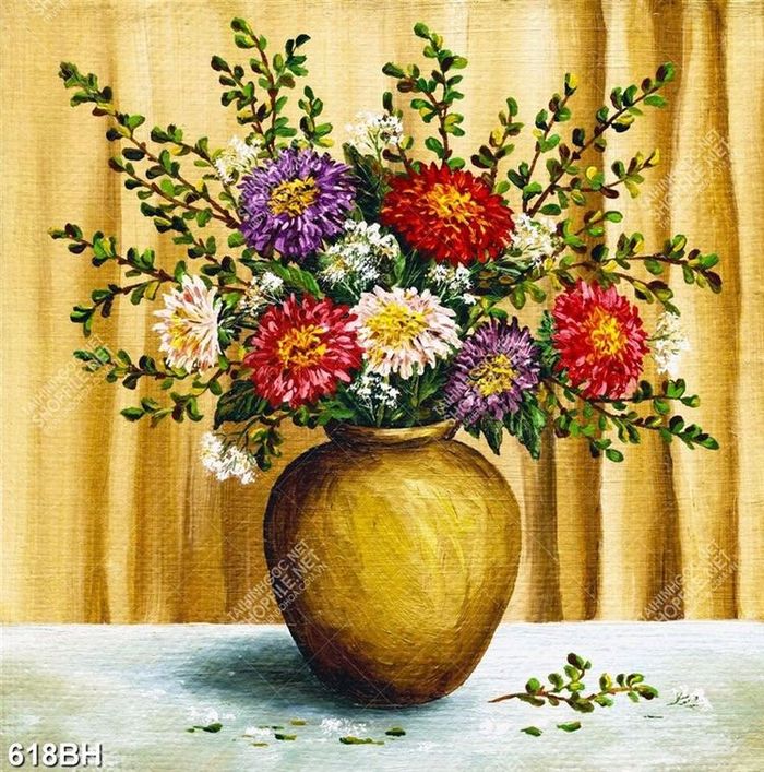 Tranh bình hoa đỏ tím nở rộ khoe sắc bên rèm cửa nghệ thuật