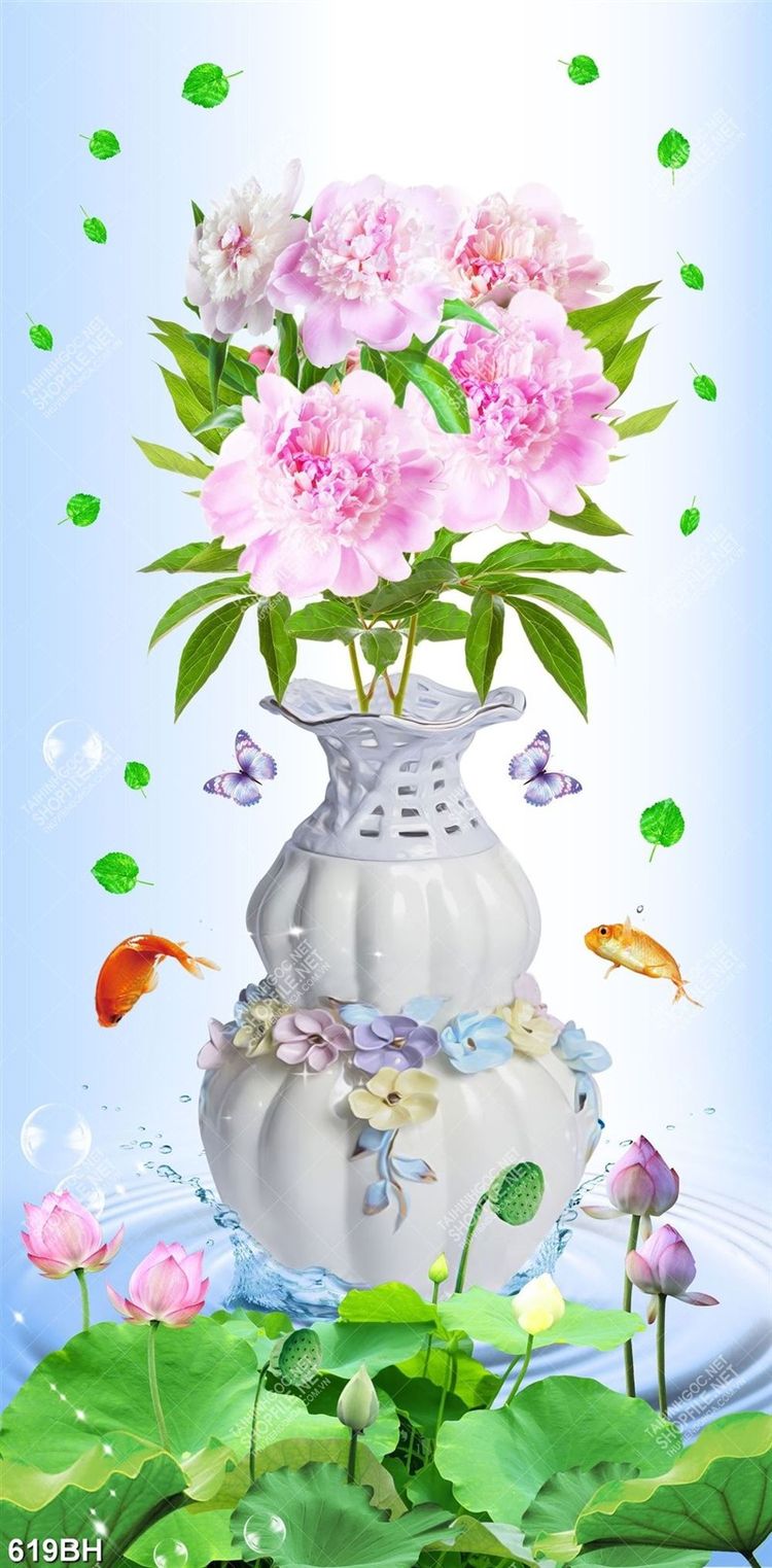 Tranh bình hoa mẫu đơn bên hồ sen và đàn cá chép vàng psd