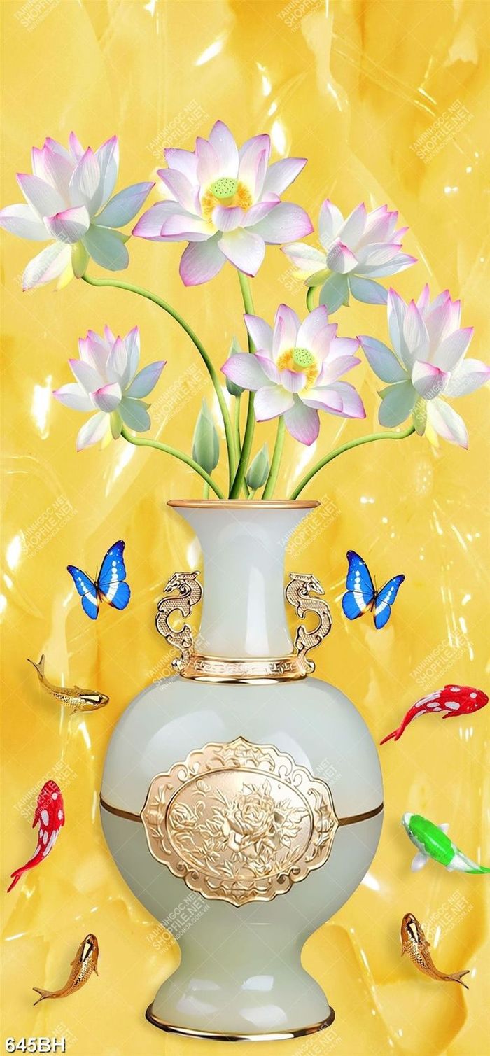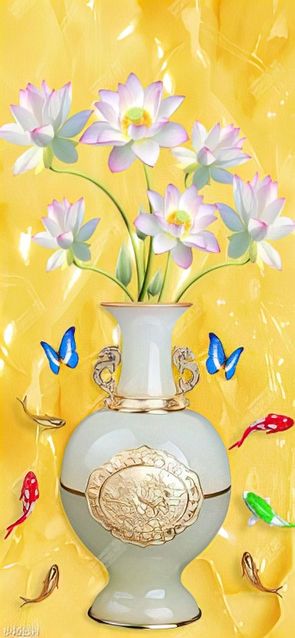 Tranh bình hoa nghệ thuật chiếc bình gốm bên đàn cá giả ngọc