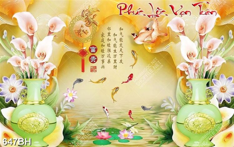 Tranh bình hoa trang trí cành hoa lục bình trong bình gốm