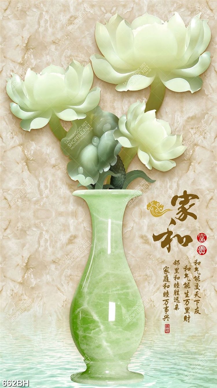 Tranh bình hoa sen giả ngọc bên dòng chữ hán decor