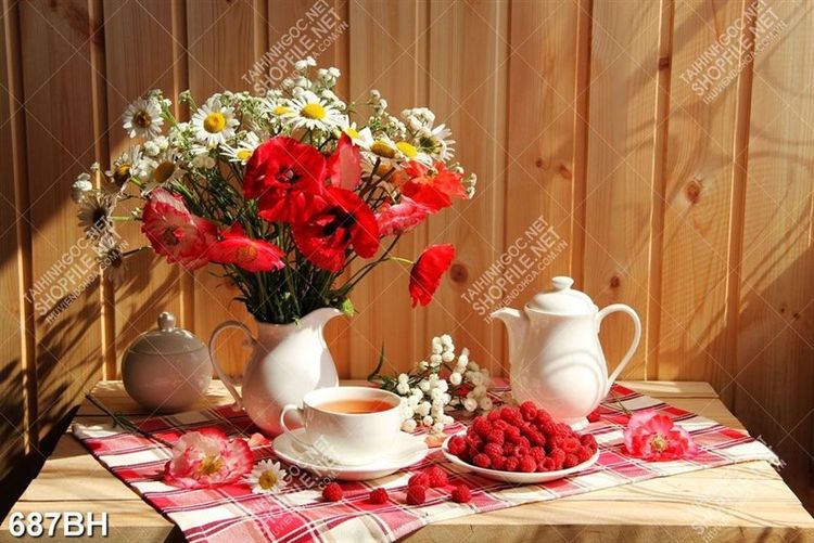 Tranh bình hoa in canvas cành hoa cúc trắng trên bàn nhỏ xinh