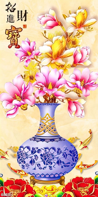 Tranh bình hoa dán tường những bông hoa mộc lan bên đàn cá