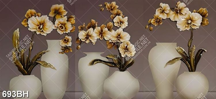 Tranh bình hoa in uv chiếc bình ngọc bên cành hoa phong lan