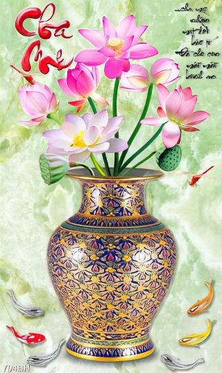 Tranh bình hoa 3d những bông hoa sen hồng bên đàn cá koi