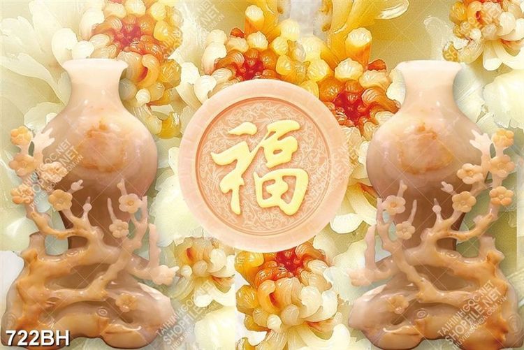 Tranh bình hoa 3d hai chiếc bình giả ngọc bên hoa mẫu đơn
