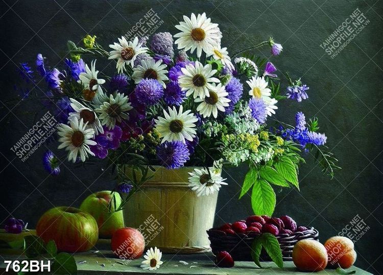 Tranh bình hoa treo tường hoa cúc trắng trên bàn đầy trái cây