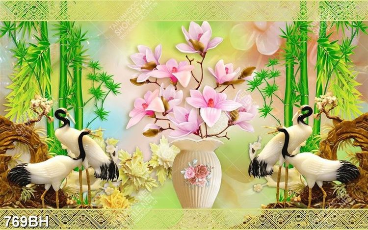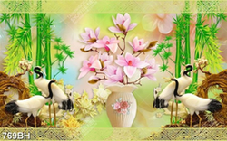 Tranh bình hoa mộc lan khoe sắc bên những chú hạc trang trí