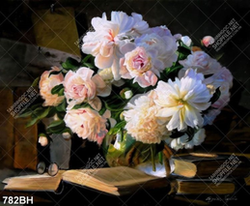 Tranh bình hoa in 3d cành hoa mẫu đơn trắng trên chiếc bàn