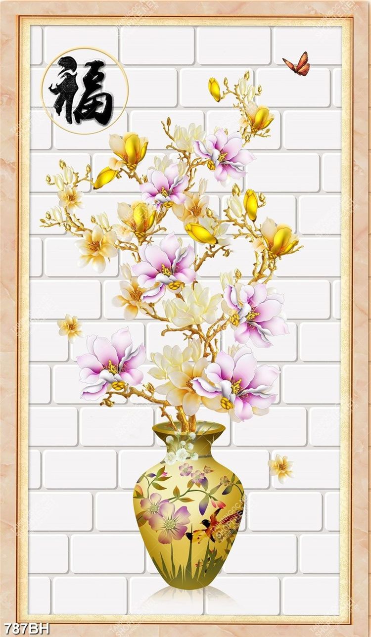 Tranh bình hoa psd cành hoa mộc lan trên nền tường gạch