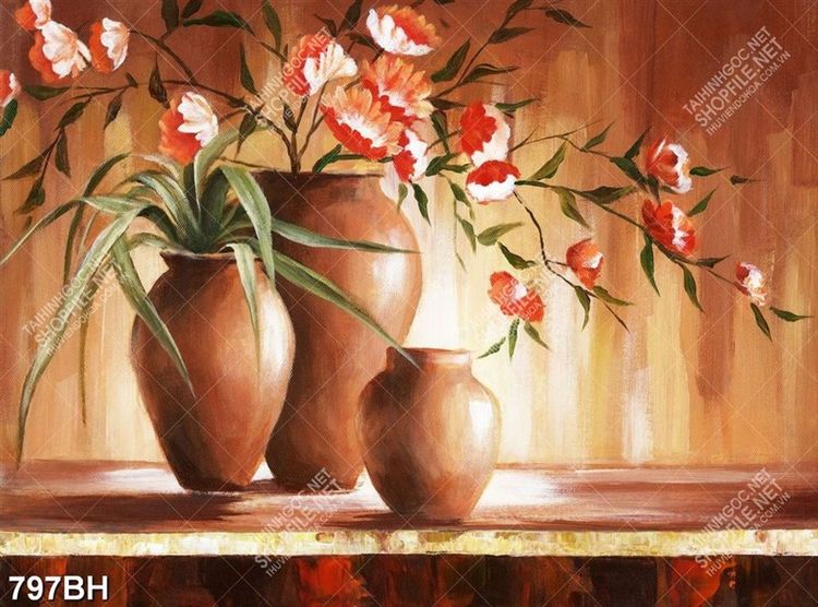 Tranh bình hoa trang trí những bông hoa đỏ bên bức tường gỗ