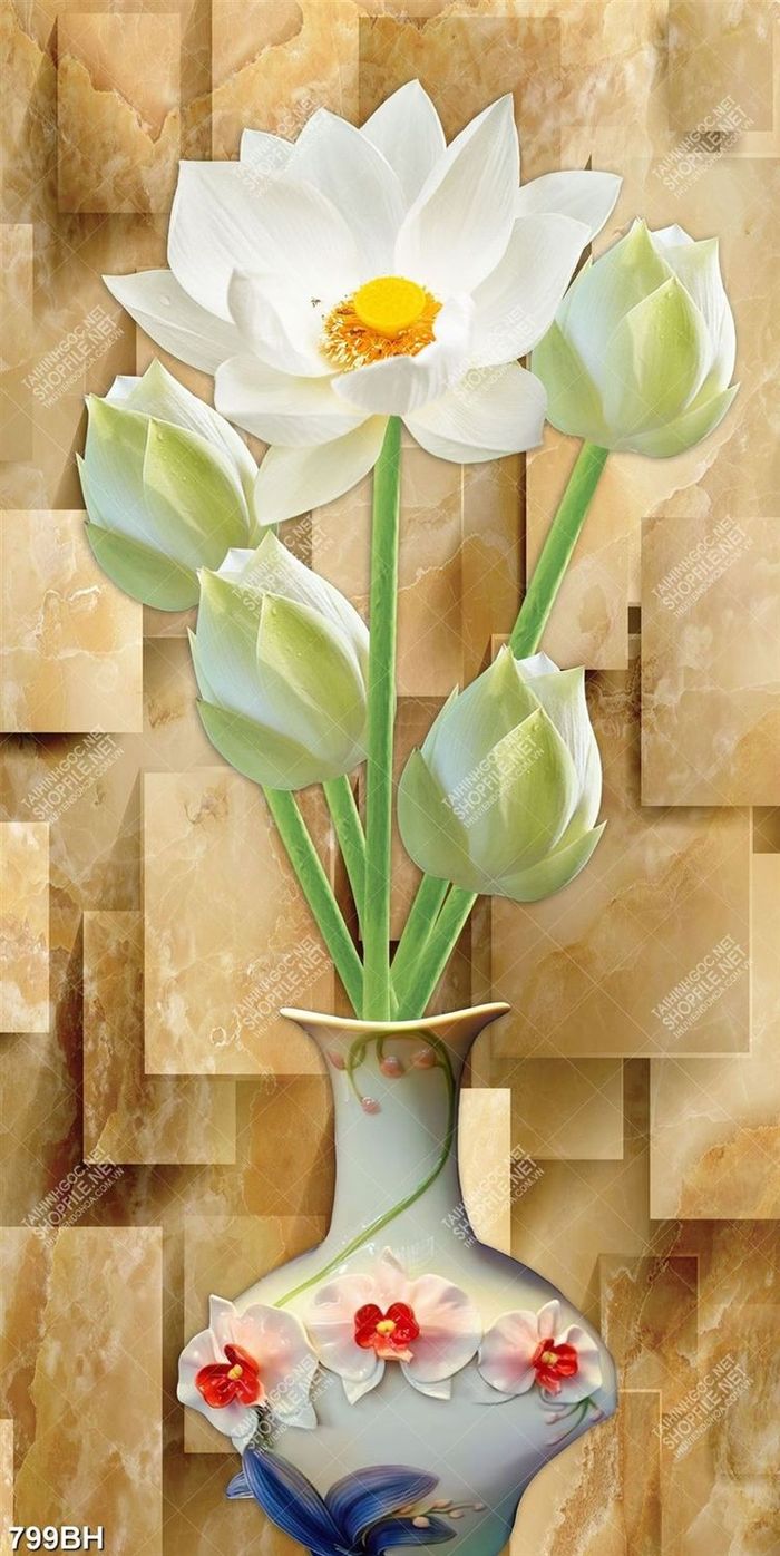 Tranh bình hoa sen trắng trên nền gạch giả ngọc treo tường