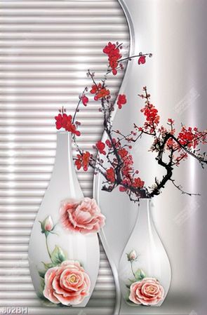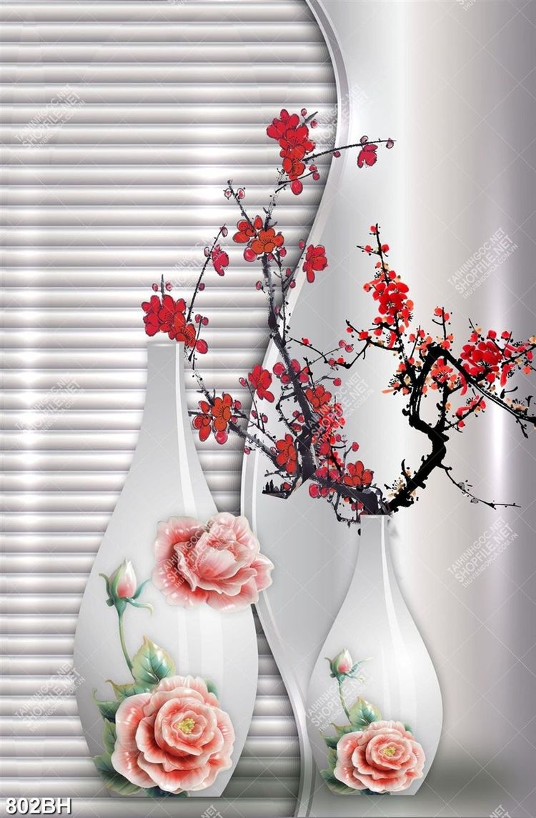 Tranh bình hoa dán tường những cành hoa đào đỏ rực khoe sắc