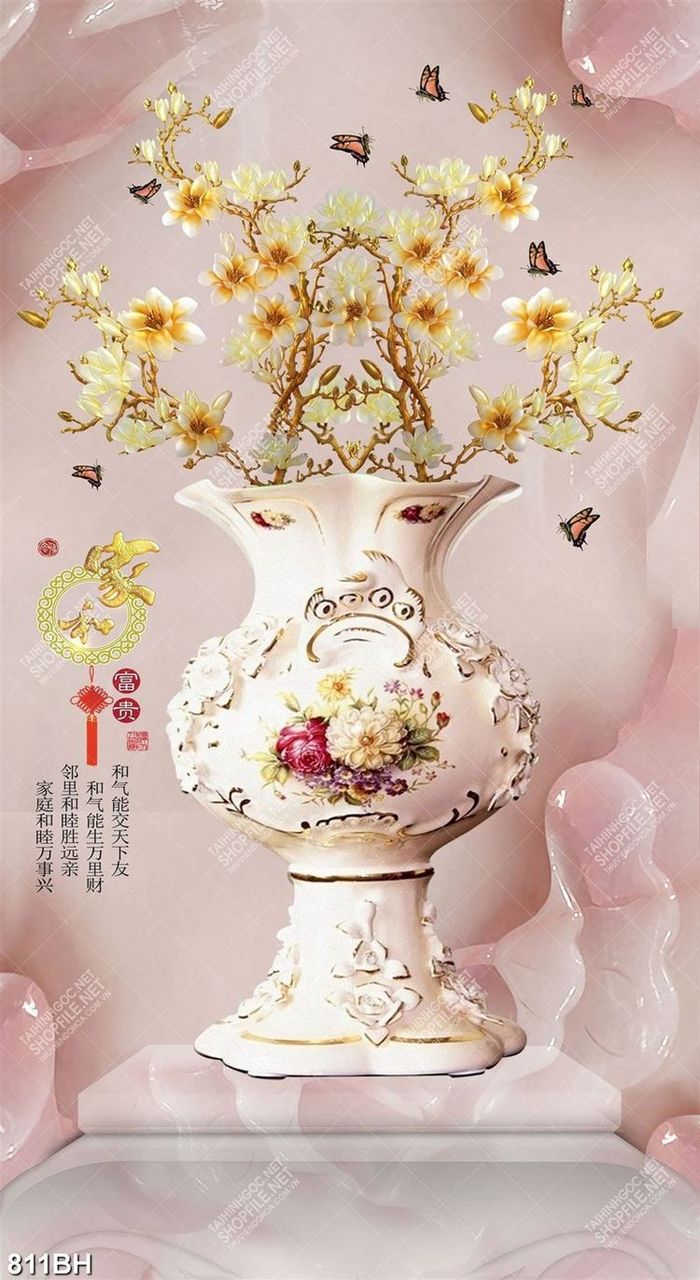 Tranh bình mộc lan và chữ hán bên đàn bướm dán tường