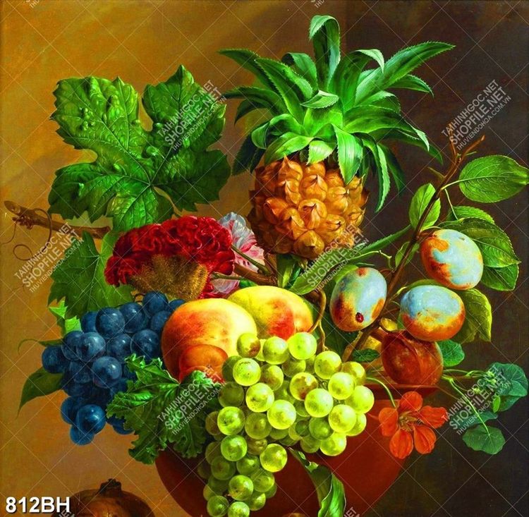 Tranh bình hoa decor những trái cây tươi ngon trên bàn gỗ