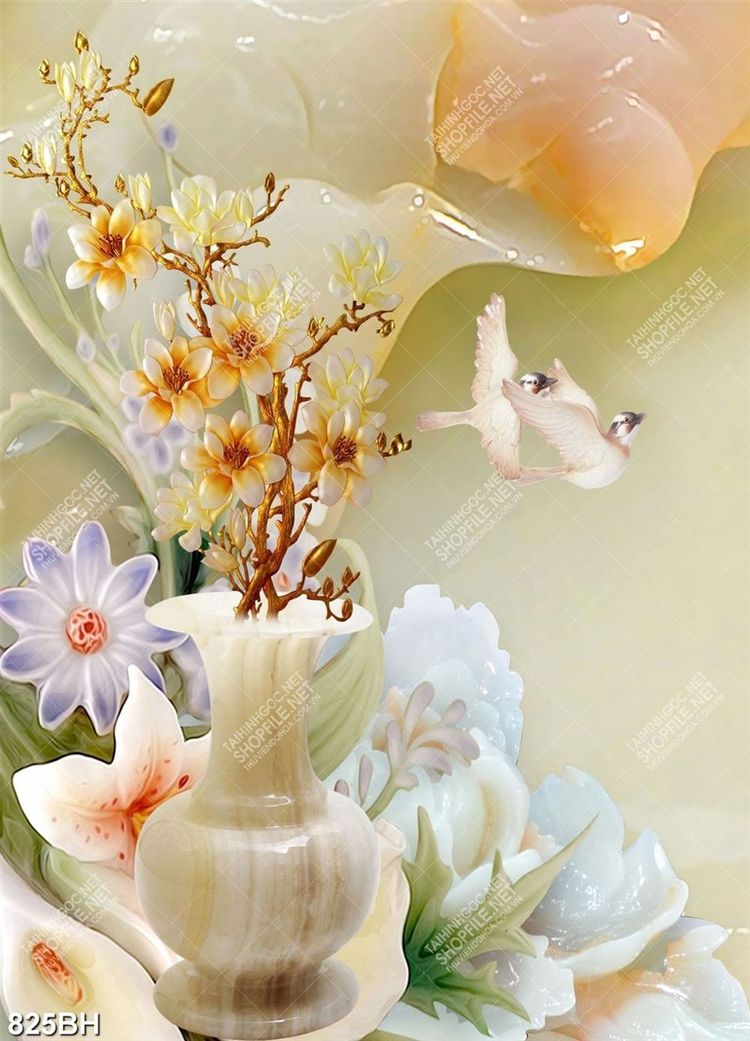Tranh bình hoa in uv những cành hoa mộc lan bên đôi chim