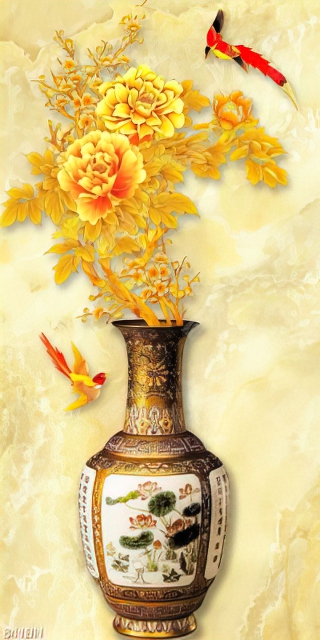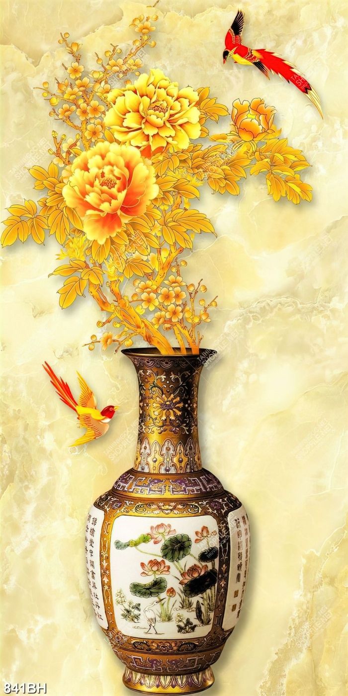 Tranh bình hoa mẫu đơn dáp vàng và chú chim ri bay lượn psd