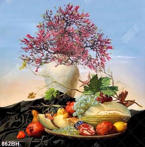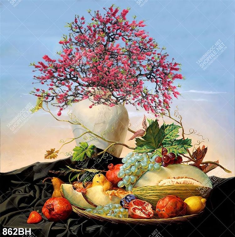 Tranh bình hoa treo tường cành anh đào đỏ bên đĩa trái cây