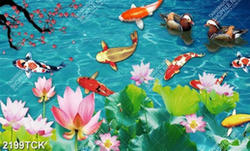 Tranh in canvas đàn cá chép và đôi chim bên hồ sen