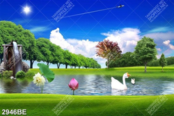 Tranh chim thiên nga và hồ Sen in kính bếp