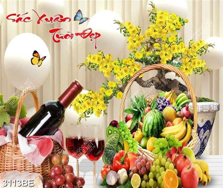 Tranh rau củ quả và chậu mai in kính bếp
