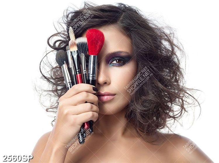 Tranh spa người đẹp cầm cọ trang điểm che đi một bên mặt
