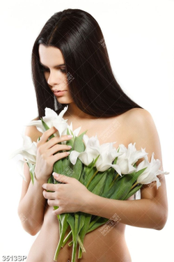 Tranh cô gái ôm bó hoa trắng che đi vòng một treo spa