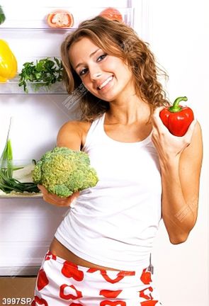 Tranh cô gái trẻ đứng bên tủ lạnh