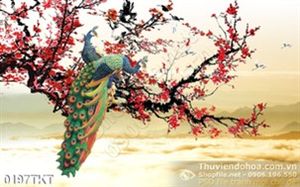 Tranh thư pháp chim công và hoa đào