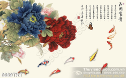 Tranh thư pháp hoa mẫu đơn và cá chép
