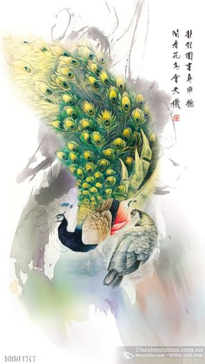 Tranh thư pháp chim công nghệ thuật