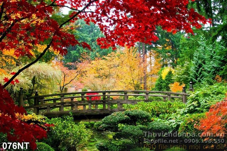 Tranh cây cầu trong công viên mùa thu