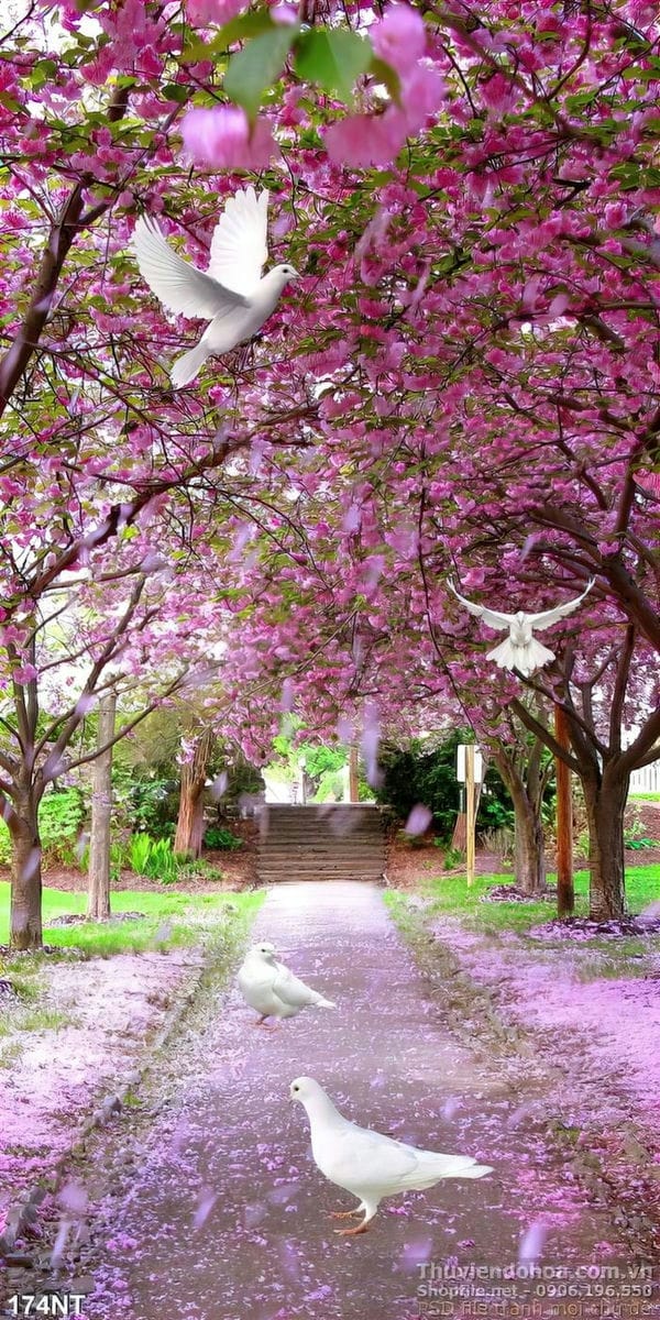 Tranh rừng đào và chim bồ câu