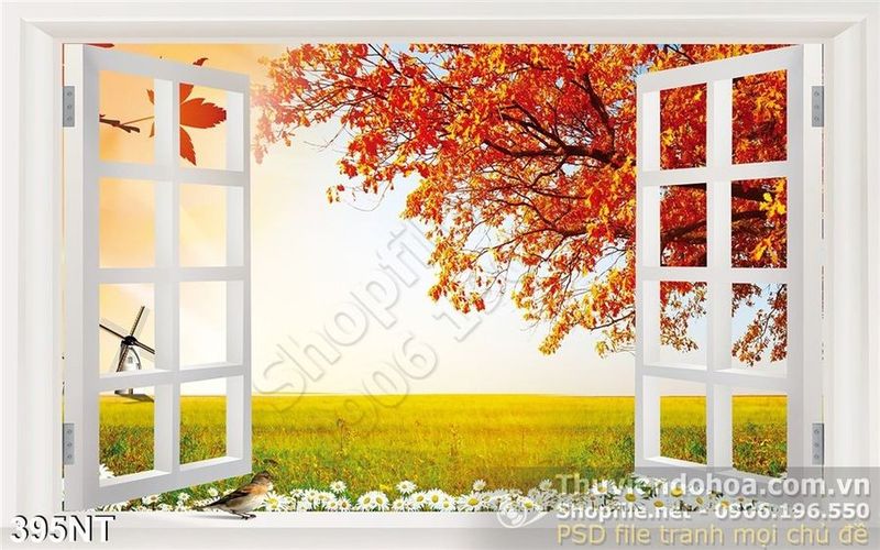 Tranh cửa sổ mùa thu và cối xay gió