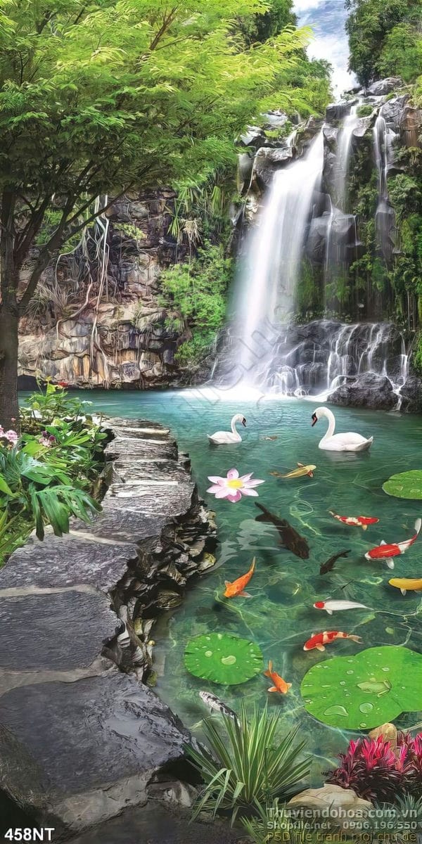 Tranh phong cảnh cá chép Koi và thác nước phong thủy