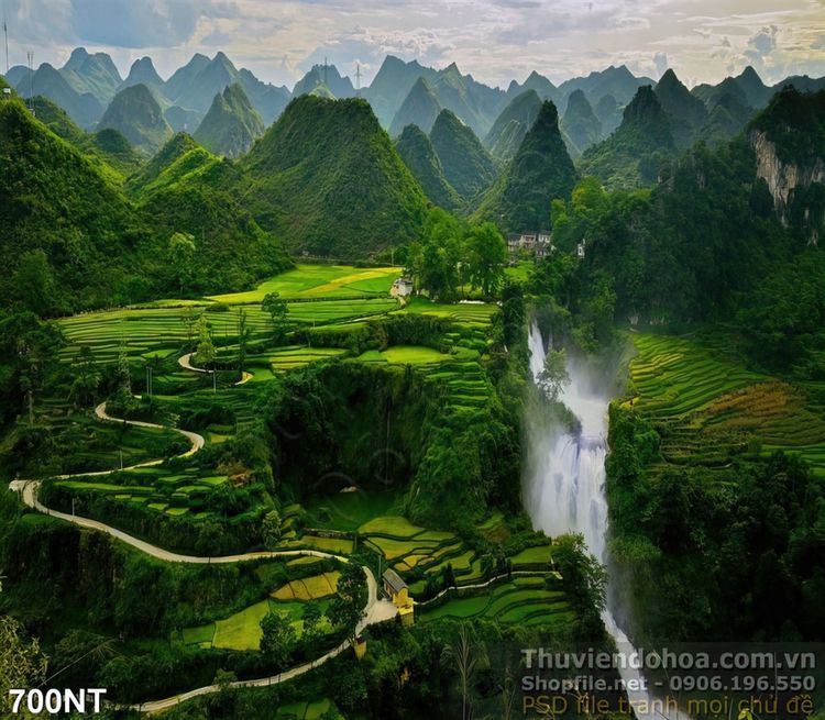 Tranh cánh đồng lúa và núi