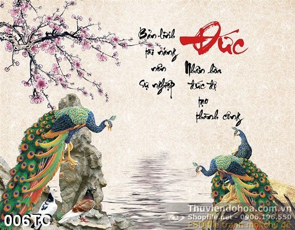 Tranh chim công và hoa đào chữ đức thư pháp 3d