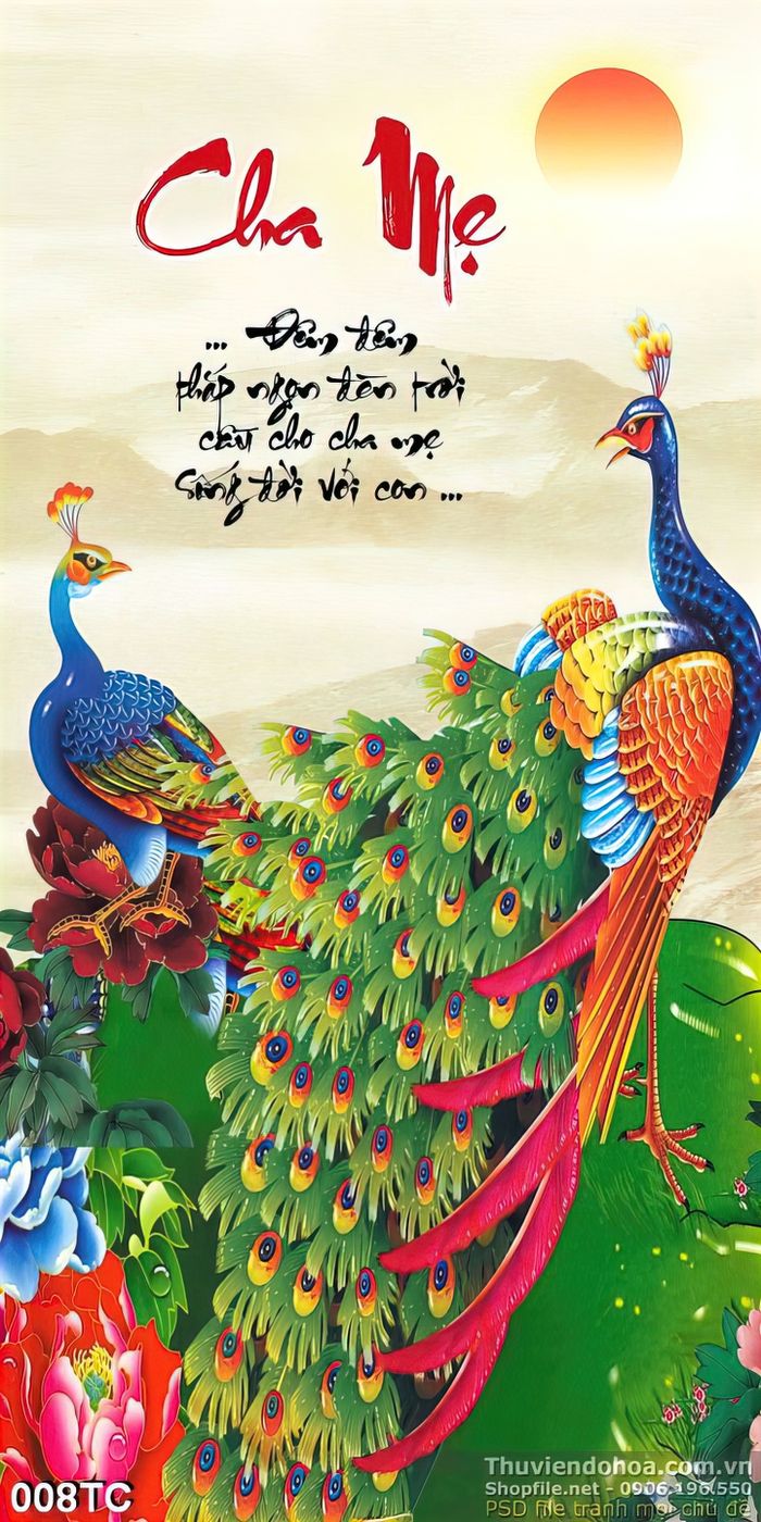 Tranh chim công in uv về chữ thư pháp cha mẹ