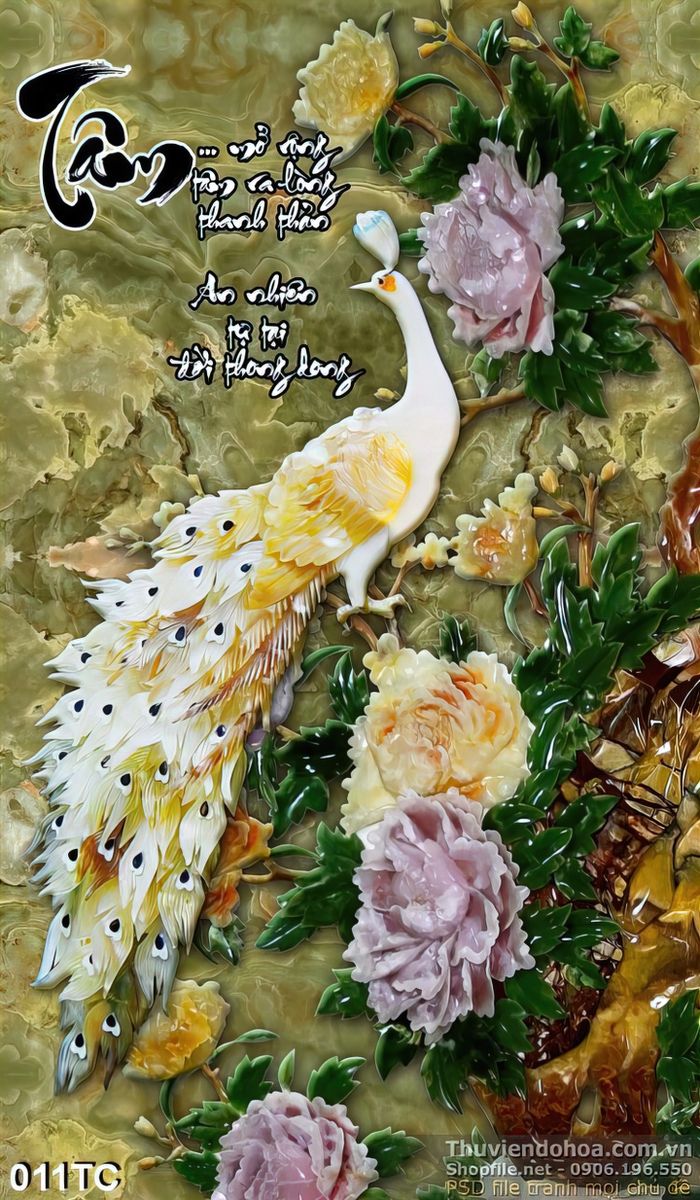 Tranh chim công khổ dọc giả ngọc wall chữ tâm