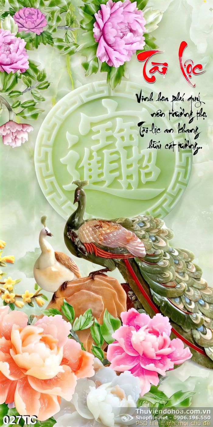 Tranh chim công và giả ngọc hoa mẫu đơn tài lộc 3d