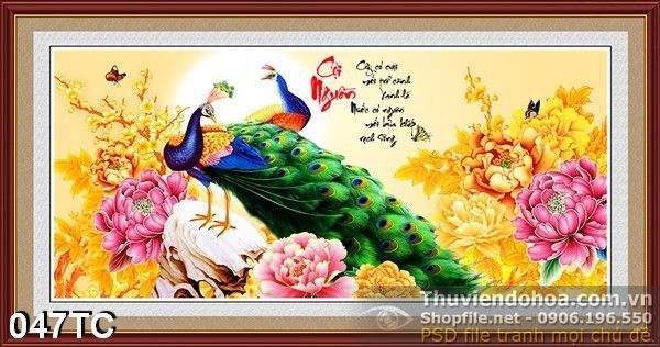 Tranh chim công khổ ngang in uv và hoa mẫu đơn