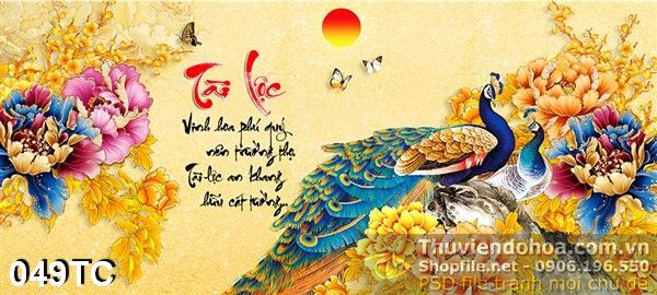 Tranh chim công tài lộc và hoa mẫu đơn