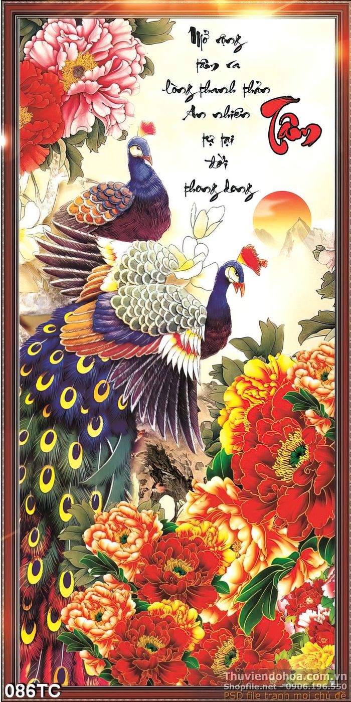 Tranh chim công bên nhau chữ tâm thư pháp đẹp
