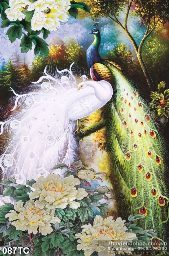 Tranh chim công vẽ tay màu trắng ấn tượng đẹp 3d