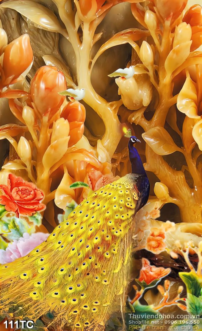 Tranh chim công màu vafnhg và cây giả ngọc đẹp