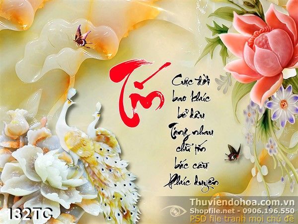 Tranh chim công chữ tín và hoa sen giả ngọc 3d