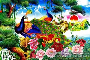 Tranh chim công sơn dầu cảnh mặt trời mọc